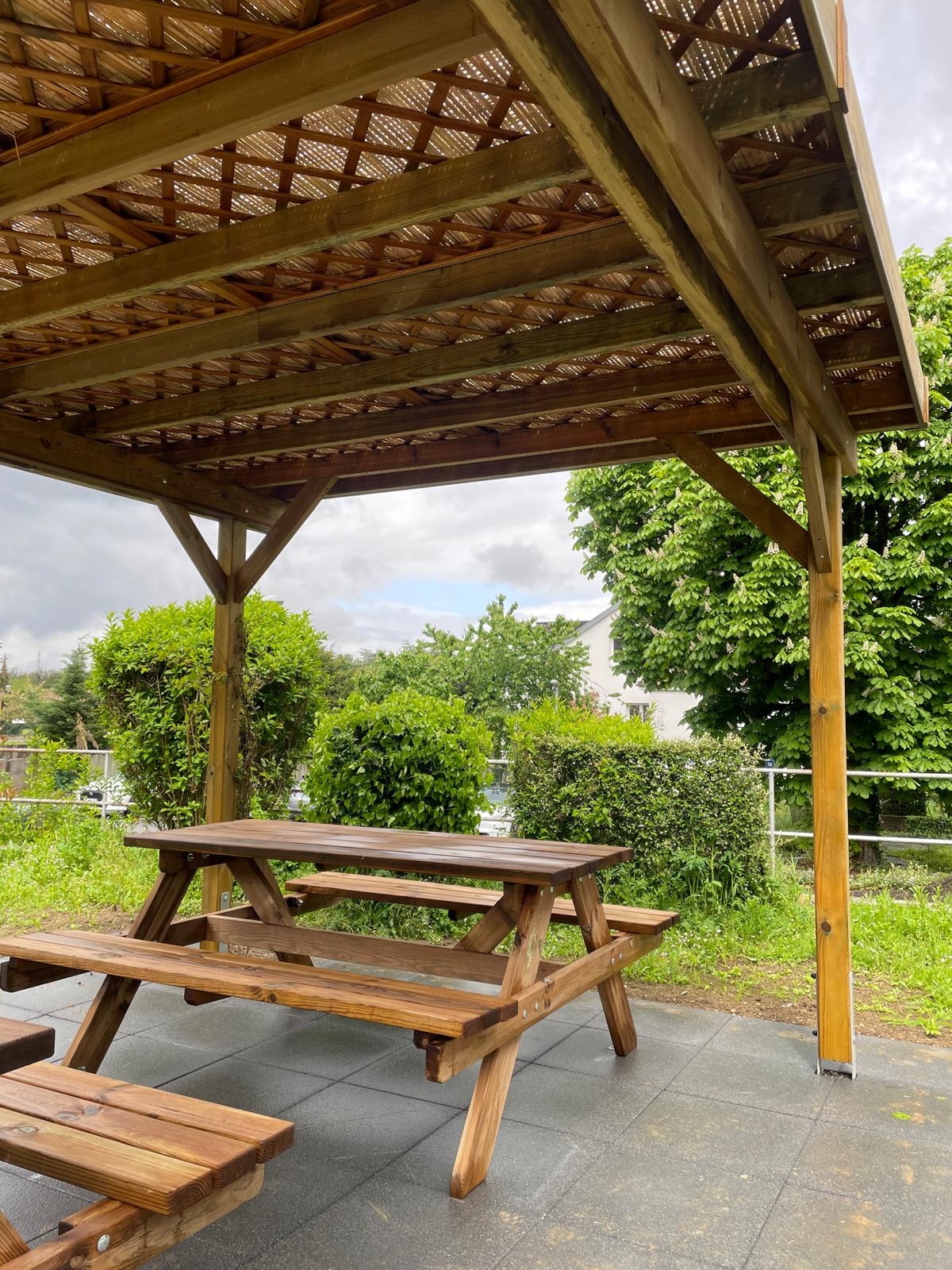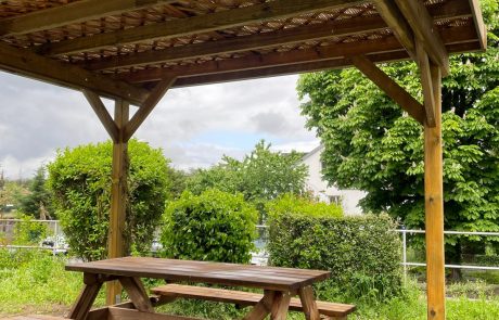 – le salon « pique-nique », conçu dans nos ateliers : table et bancs assemblés pour une solution pratique. Finition supérieure en poutrelles 11/5cm.
